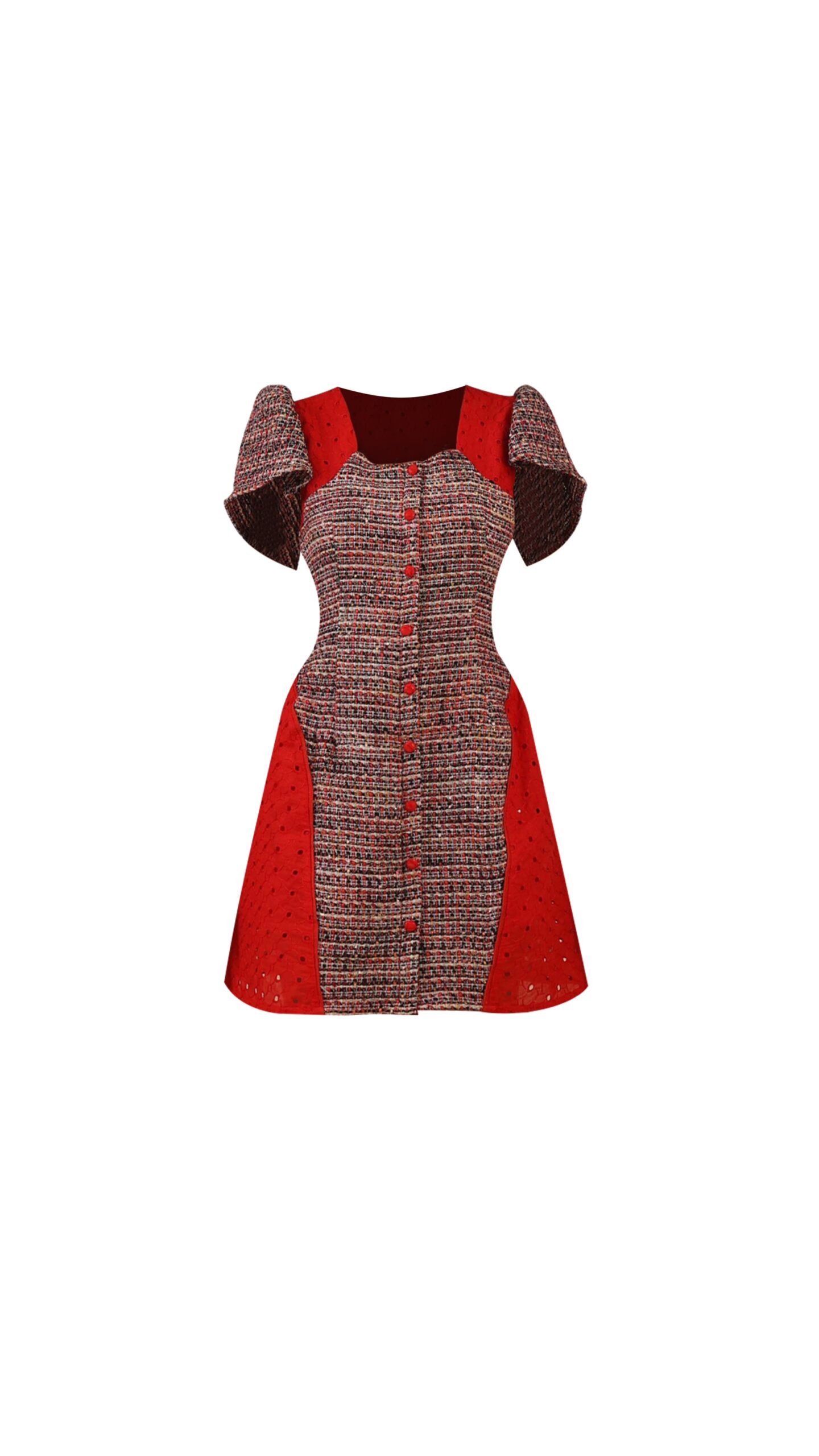 Meet the Rorie Dress a refined look in uncompromising Style. Experience effortless elegance with the Rorie dress, a striking piece featuring square neckline, flared sleeves, and a row of decorative front buttons, all perfectly complemented by the luxurious blend of tweed, dry lace, and Aso Oke intricately piped around the skirt. The Rorie dress, an exquisitely crafted piece that seamlessly blends sophistication, femininity and comfort.